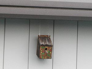 | 以前作った巣箱を戯れに車庫の軒先にぶら下げておいた。風が吹くとブラブラして住み心地が悪そうだ。 時々スズメがとまってさえずっている。多分あれは雄で、「僕と一緒に住まないか。」とパートナーを募集しているのだろう。 申し訳ないが、そんな不安定な家ではお嫁さんは来てくれないと思うぞ。 |