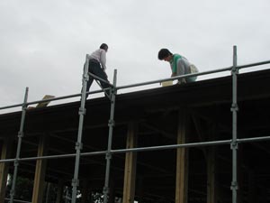 近所で家を建てている。施主夫婦が仲睦まじく、2人で屋根の板を張っている。できるところは自分でする、できないところは大工さんにたのむ、ということだそうだ。 手作りの家といえばおきまりのログハウスだったり、全部手作りするぞと意気込んだりで、ちょっと暑苦しい。 「普通の家」を「できるだけ」自分たちで作ろうというのが良いね。 |
