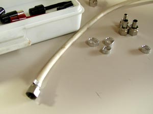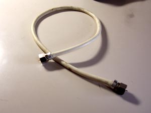 適当な長さの同軸ケーブルの両端にプラグを取り付ける。どちらも量販店のアンテナコーナーにある。全部で500円くらい。
