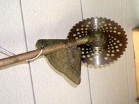| 身近な道具の中では、草刈り機はチェンソーの次に危ない道具だ。 →→ どちらも下手に使うと、キックバックで自分の方に向けて刃がはじかれて来る。 |