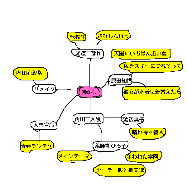 | で、ビデオやさんへ行ったら、「さびしんぼう」は珍しく貸し出し中。じゃあ、もう何でもいいやと言うことで、「セーラー服と機関銃」を借りる。原作が一応推理小説なので、「時をかける少女」と違ってストーリーがちゃんと有る。 薬師丸ひろ子の使う二人称が「おたく」なので懐かしい。友だちに「おたくたち、もう学校へ行ったら。」とか、二丁拳銃で抗争相手の組員をガンガン撃ち殺しながら「死ねば、おたくら。」とか。 あの頃はみんな相手を「おたく」と呼んでいた。もちろん私も。大阪から来たヤツだけが「じぶん」と呼んでいたのがおかしかった。 この「おたく」がオタクの語源だそうだが、それならあの頃の大学生はみんなオタクだ。 |