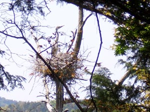 もう余呉湖に着くかな、というあたりでガアガアという激しい声がする。何だろうと見回すと、道から少し離れたところにカワウの巣が幾つかあった。 トビがグルグル回って、ヒナを狙っているようだ。カワウの親が警戒して大声を出しているらしい。そこへ我々が近づいたので、さらに大騒ぎになった。 余呉湖の駐車場近くに降りる。大音に寄って、妻の車を回収して帰る。 |