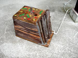 以前、職業・家庭の時間に巣箱を作ったとき、見本に私が作ったものだ。 正面は絵の具で絵を描いてニス塗り。側面は杉の焼き板。天井は木の枝を敷き詰めてある。という具合で、なかなか凝った作りだ。雨漏りしないように要所はコーキングしてある。さしずめ、一戸建て高級住宅と言うところか。 |