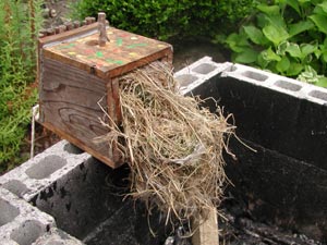 | 掃除がしやすいように、底が開くようにしておいた。開けてみると、なかにぎっしり草が詰め込んである。入っていないと思いこんでいたので、掃除をしてやらなかったから、何代も上へ上へと積み重ねていったのだろう。 やはりヒナは居なくて、中で音を立てていたのはハナアブだった。 |