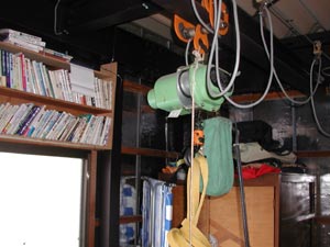 | 車庫の二階には電動ウィンチが取り付けてある。レールで自由に動く。 車庫と言っても実態は農業用倉庫なので、こいつは俄然便利。 |