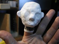 白目と歯を描く。うへ〜、気色悪い。かなわんな。 黒目や唇を描くと、まあそれらしくなる。 |