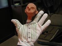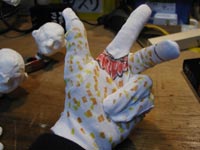 | 肌色を塗って、乾かしている間に、胴体を作る。 と言っても、白い手袋にマジックで描くだけ。 |