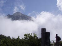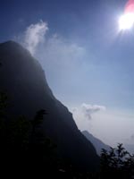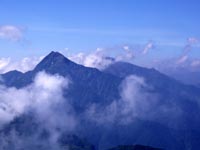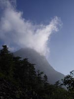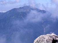 だんだん摩利支天が見えてくる。8時過ぎにはもうガスがかかってきた。 仙水峠に着くと、目の前に摩利支天が立ちはだかる感じに見える。 |
