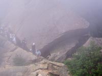 | 巻き道を下って行くと、眼下に摩利支天が見える。簡単に行けそうだ。 下から見たときは、あんなに近づき難く思えたのに。 |