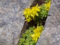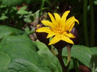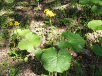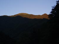 朝飯を食ってテントをたたむ頃には、小仙丈に朝日があたってくる。上天気だ。 つわぶきがたくさん生えている。これ食えるんじゃないか、とか思いながら歩く。 |