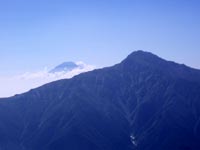 | 360度大パノラマとはこのことか。天気のせいか駒ヶ岳より景色がよい。 北岳と富士山。→→ |