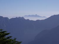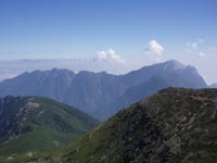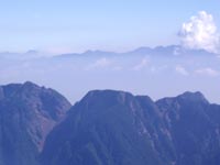 鳳凰三山、間の岳、農鳥や塩見岳、その向こうの南アルプスの山々。遠くは北アルプスの槍や穂高も見える。 あれが浅間山と教えてくれた人が居たが、どれか分からなかった。 |