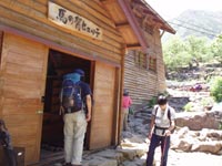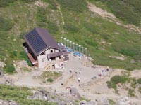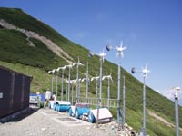 | 仙丈小屋は屋根にはソーラーパネル、横には風力発電のハイテクだ。中は分からないが、山の上の小屋にしてはずいぶんきれいな感じ。 ↓↓ →→ |