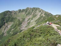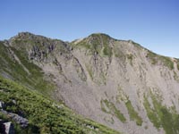 | 藪沢カールと仙丈ヶ岳の山頂。なにしろ雄大。カメラに収まらないので、後で合成してパノラマにしようと、写真を撮りまくる。 | ![]() |