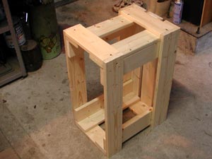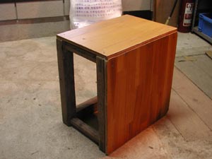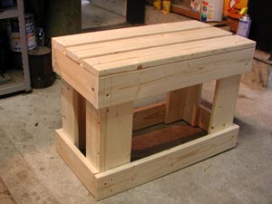 これは今まで使っていたもの。昔の掘りごたつのやぐらを捨てるのももったいないので、2面に板を張って作業台にした。床板に使った合板の残り物なので滑って使いにくい。