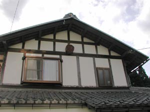 すき間にコーキングする作業自体は大したことはない。問題は足場だ。ひさしに登って、ハシゴを壁に立てかけるのが厄介だ。 ハシゴが滑り落ちないように固定する必要がある。ハシゴでカワラを踏み割らないように、板をひかなければならない。 2週間ほど前に柱に金具をねじ込んでロープを引っ張れるようにしておいた。あわててハシゴを縛り付けてよじ登る。 |