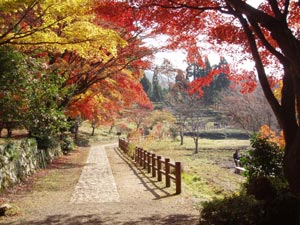 写真ではきれいに見えるが、実際には茶色になってしまった葉が多く、全然駄目だ。雲が切れて日差しが強くなったところを狙って、逆光で撮れば何とか見られる写真になる。 中高年のアマチュアカメラマンがいかにも高価そうな機材を抱えて行き来しているが、良いスポットはそれほど無いので、その辺は渋滞気味だ。 |