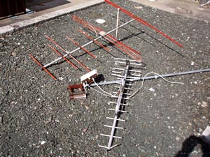 | テレビの映りがどうも良くない。ケーブルテレビなのに困るなあ、などと思いながら屋根に上がってみる。見るとケーブルの引き込み線からテレビに至るまでに、分配器が3個も入っている。 どうやらケーブルテレビと衛星放送の両方をつなぐために、タコ足にしたらしい。 業者にまかすとこれだから。配線を直して、ついでに放置してあったアンテナを取り外す。バッチリ映るようになった。 |