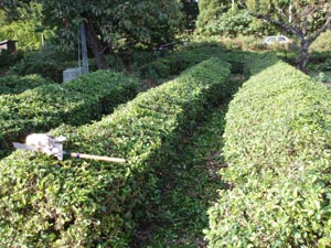 午後、茶の木を整形する。手摘みから機械摘みにシフトするために、整形し始めてから3年目だ。大分良い形になってきた。手間を少なくするための段取りに、けっこう手間がかかる。 ついでに、じゃまになっている栗の木の枝をバッサリ切る。 |