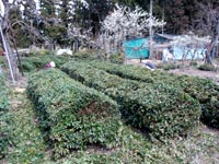 静岡県の農事試験場のサイトを見ていたら、夏と2月か3月の2回整形せよと書いてあった。例年ならば雪があるのでそんなことは不可能なのだが、今年は記録的に雪が少ないので、ともかくやってみる。 一度整形してあるので、楽な仕事だ。とは言え、刈り込みばさみなどでやっていたら大変だ。電気トリマーでバリバリやっつける。 |
