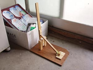 | 現在設置している「猫よけ機」が良くできていて、しばらく侵入してこなかった。「来られるものなら来てみろ。」とかうそぶいていたら、どうしたものか入り込んでゴミ箱をひっくり返したりカマボコを盗んだりする。ツバメも不安そうな声を出すことが多くなった。 そこで、エサを引っ張るとバネ仕掛けで頭をひっぱたく装置を製作して設置した。一罰百戒、これで来なくなれば良いのだが。 バネ150円、他は廃材利用。 |