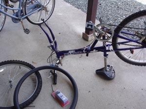 自動ネコたたき機を作ったついでに、妻の自転車のパンクをなおす。量販店で買った一見マウンテンバイク風の折りたたみ自転車だが、中国製の安物だ。 タイヤをはずそうとしたが、「どのレンチも合わない。」恐るべし中国製。モンキーとペンチを使ってはずす。 |