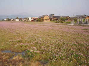 | 泥の中を歩き回ったので少し疲れたが、昨日の飲み会で職場に置いてきた車を取りに行く。転勤して職場が遠くなったので、自転車で1時間ちょっとかかる。 車では通れないような、できるだけ通ったことのない道を選んで行く。見渡す限りのレンゲ畑が有った。この時期に耕作していないと言うことは、今年は米を作らないのだろう。 |