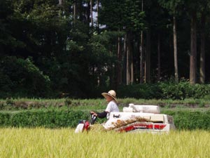 | 隣の家が稲刈りを始めた。天候が怪しい。雨が降る前に終わらないとまずいので、手伝いの押し売りにいく。 コンバインが田んぼをグルリと一周するたびに籾の袋を軽トラまで運び上げる。その間することもないので軽トラのそばでウトウトして、コンバインが近づいてくると目を覚まして仕事をする。ノンビリした半日を過ごした。 |