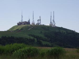 | 美ヶ原はまるっきり平らというわけでもなく、少し小高いところが「王ヶ頭」で、これでも日本百名山の一つ。アンテナ群がある。 時間もないことだし百名山に興味はないので、そこまで行かずに引き返す。 |
