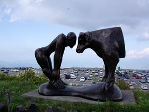 牧場の裏手あたりの「美ヶ原高原美術館」に寄る。広い斜面に立体の作品が点々としている。面白い野外美術館だ。不思議の国に迷い込んだような気分を味わえる。 良い施設だが、ここまで来るのが大変だ。「ビーナスライン」という観光道路があるが、あまり立派な道ではない。 |