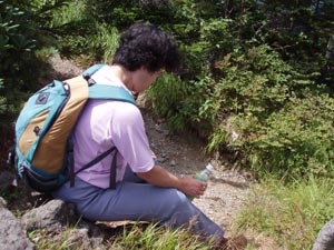 | 北横岳だけではあっけないので、ペンションの主に勧められた大岳(おおたけ)に足を伸ばす。 こちらはほとんど人が来ない。大きなリュックをしょった学生の一団が少し行きかけて、道が険しいのにビビッて引き返してきた。 距離はたいしたことはないのだが、足元の悪い道を大きな溶岩の間を歩くので、結構疲れる。めげて、座り込んでいるところ。 |