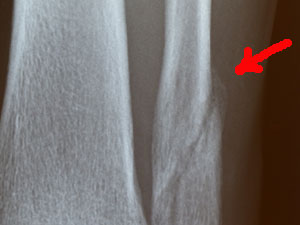 今日のレントゲン写真。 折れたところの影が、最初の頃とほとんど変わっていないように見える。 「治っているように見えませんね。」、と言うと、「じゃあ、もう一度撮ってきて下さい。」と言われて、やり直し。 |