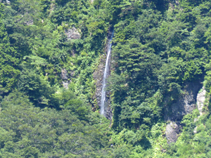 こちら側から見ると、冠山峠のすぐ下に綺麗な滝が見える。 山頂からあまり遠くない所に、こんな大きな滝があるのは珍しい。 |