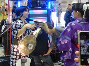 音の出るブースも多い。 この人は扇風機を逆さまに持って、ギターのように弾いていた。 |