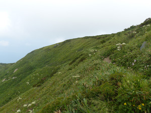 | 観光新道はずっと尾根から付かず離れず、見晴らしがよい。 もうガスってしまって、ハッキリ見えないのが残念だが、別山が真正面にずっと見えている。 道自体は、砂防新道と違って、「普通の登山道」だ。砂防新道ほど熱心に整備している様子ではない。 |
