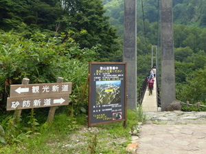 | やっと尾根筋から、別当出合への下り道になる。 これが長くて急な下りで、すっかりヒザが笑ってしまった。 登ってくる人は、みんな青息吐息だ。ばてばての人も居る。 因みに、下らずに尾根道をずっと行くと、昨日キャンプした市ノ瀬に降りることになる。 |