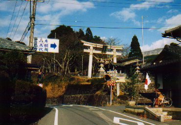 鳥居が見える。鳥居の前の道を